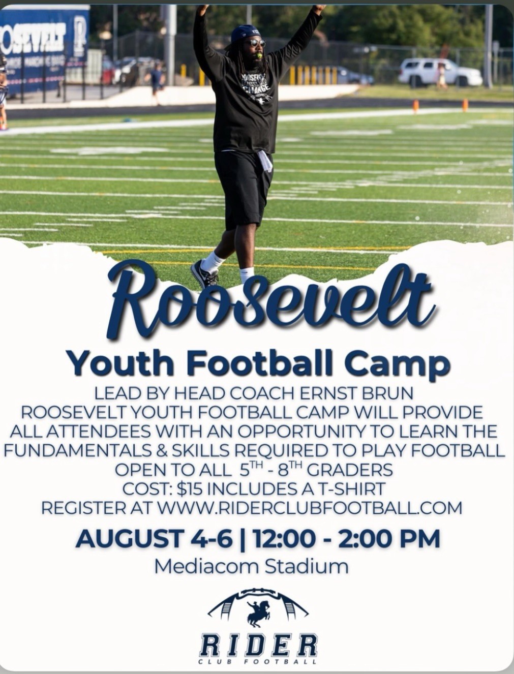 Calling all incoming 5th-8th graders planning on playing football this fall. Join Coach Ernst Brun, TRHS Coaching staff and Varsity players August 4th, 5th and 6th from 12-2pm at Mediacom Stadium for a skills camp.